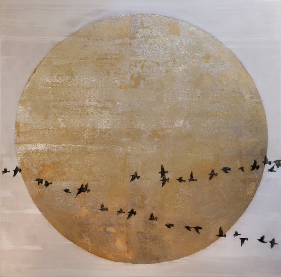 "Zugvögel" 2025 100 x 100 cm Acryl, Öl, Metall auf Leinwand